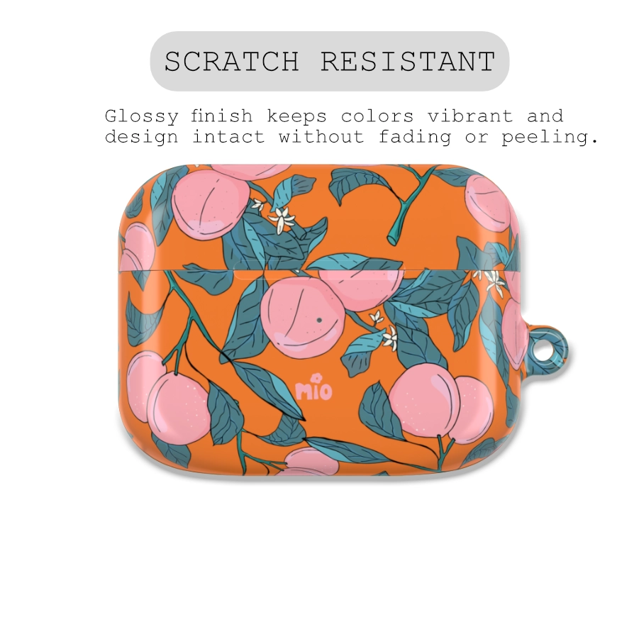 Add a burst of summer to your tech with this orange AirPod case featuring juicy peach illustrations. Fits all AirPods models. Perfect gift for tropical girls.