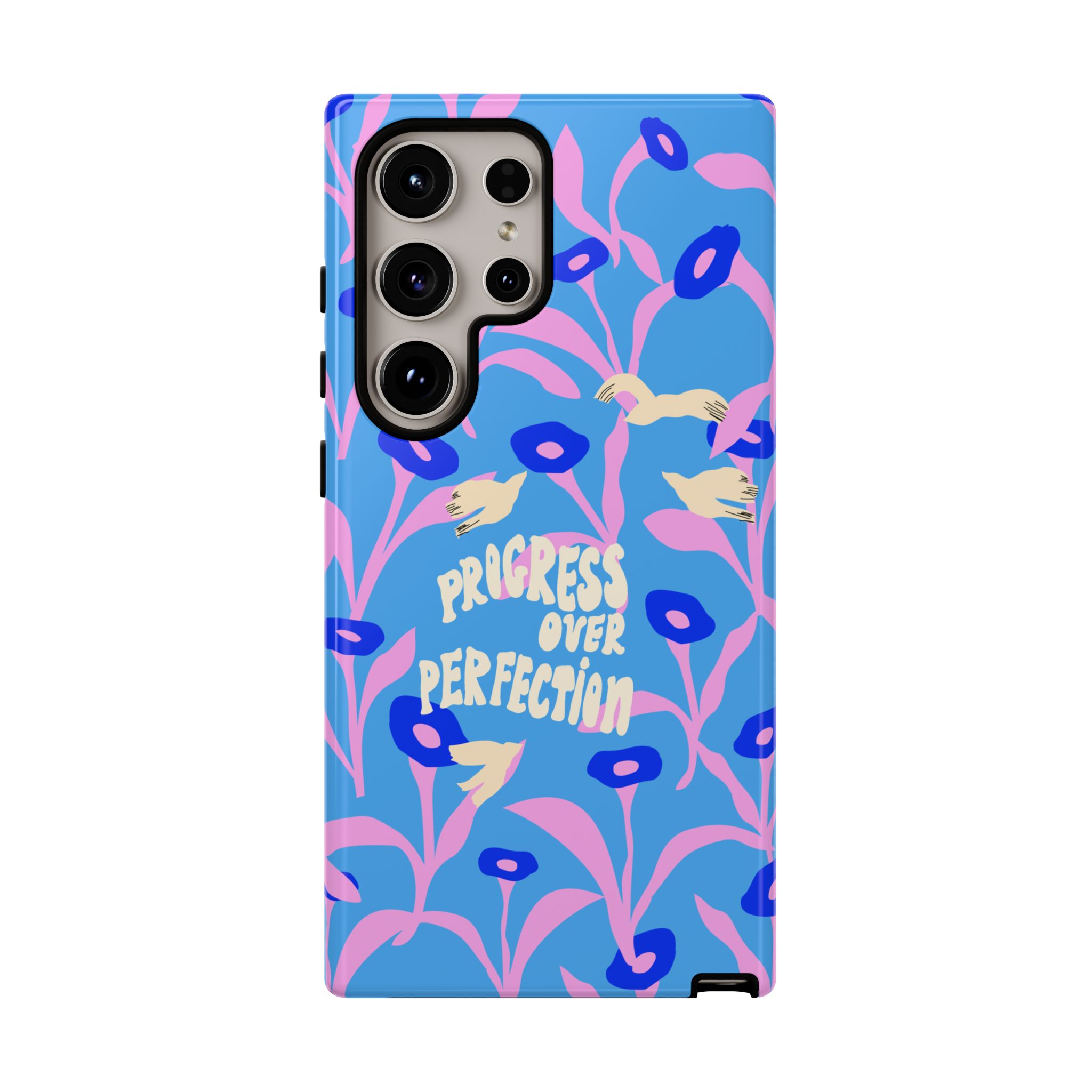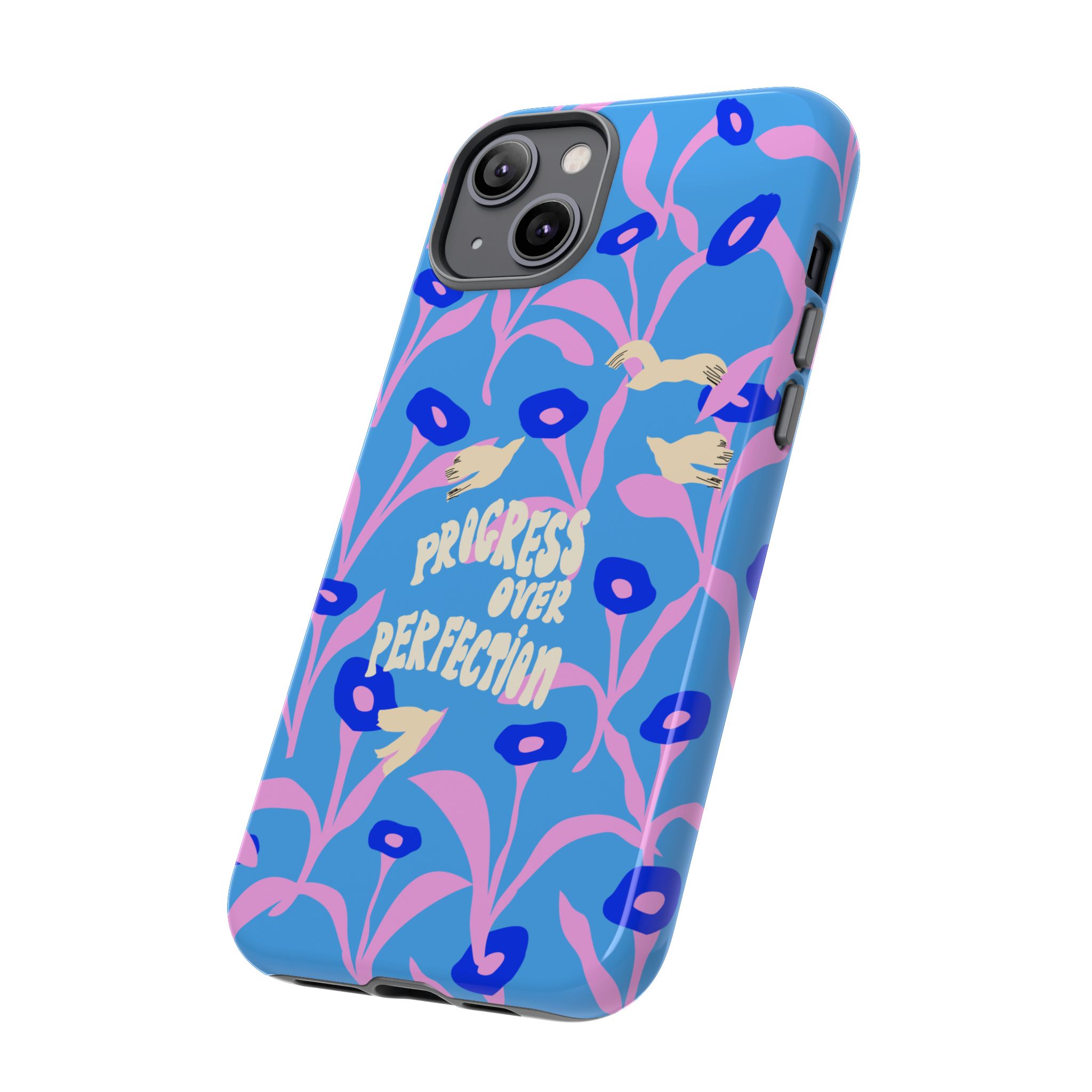 Light blue turquoise floral motivation phone case with the uplifting quote “Progress Over Perfection” from the Bold and Good Vibes Collection. Perfect for creative, bold, feminine positive people.
